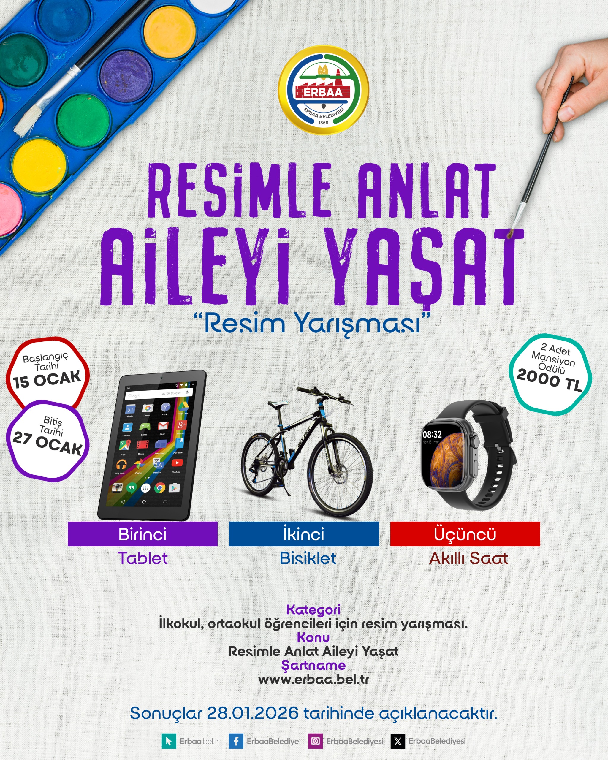 Erbaa Belediyesi olarak, aile içi iletişimi güçlendirmek, aile kültürünü desteklemek, çocuklarımızı daha yakından tanıma fırsatı yakalamak, öğrencilerin aile kavramına ilişkin duygu, düşünce ve deneyimlerini görsel sanatlar yoluyla ifade etmelerini sağlayarak; aile bağlarının, sevgi, saygı ve dayanışma gibi temel değerlerin önemine yönelik farkındalık geliştirmek amacıyla düzenlediğimiz “Resimle Anlat Aileyi Yaşat” konulu resim yarışması etkinliği düzenlenecektir.